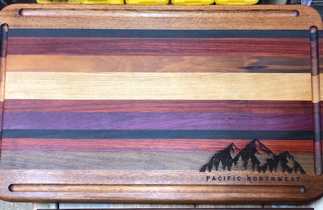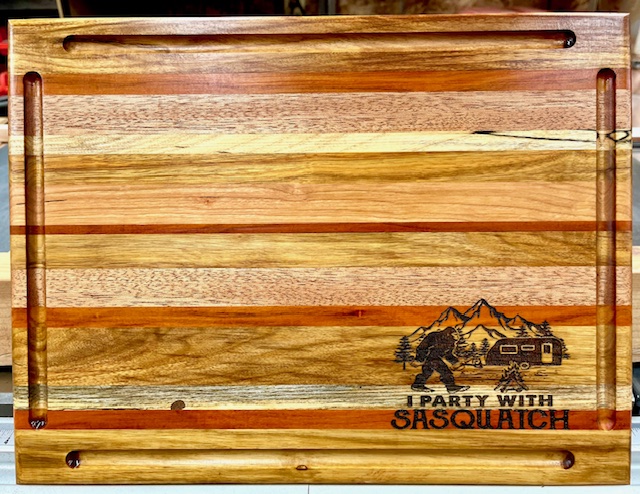 Jerry spends time in the woodshop handcrafting cutting boards and charcuterie boards. He also uses two different diode / infrared lasers to engrave the boards along with metal drink ware including water bottles, wine tumblers and whiskey flask.