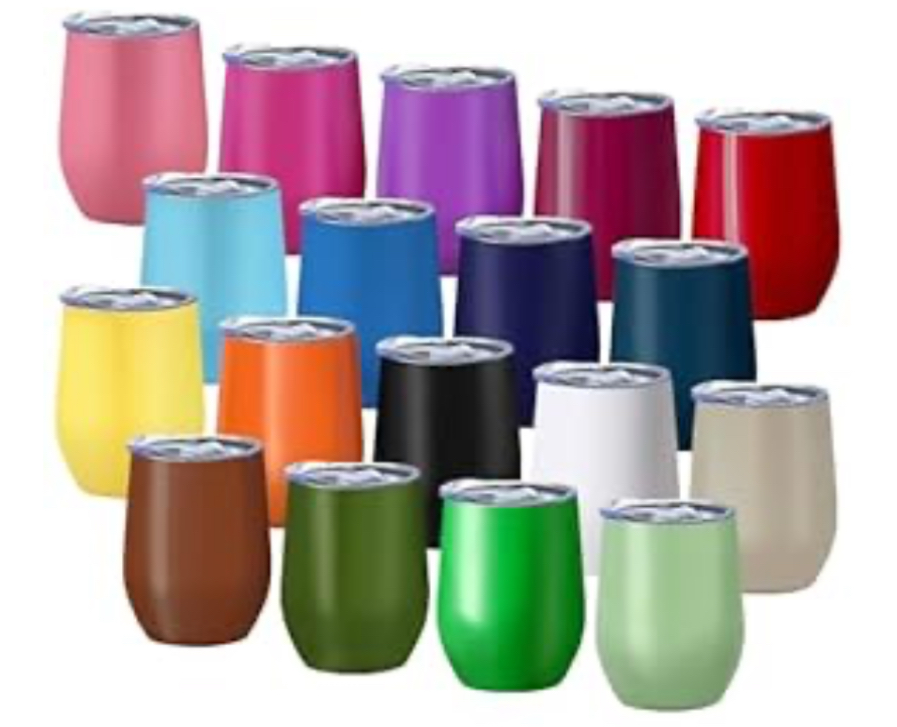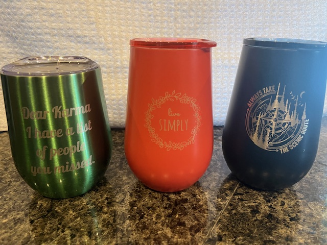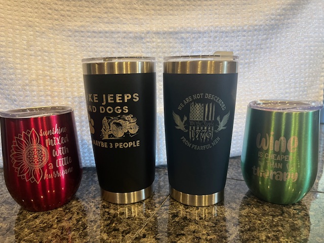 We have a large selection of colorful stainless steel mugs, coffee cups, wine tumblers, whiskey flask on hand. We’ll custom engrave them with your choice of design or pick from hundreds of our designs.