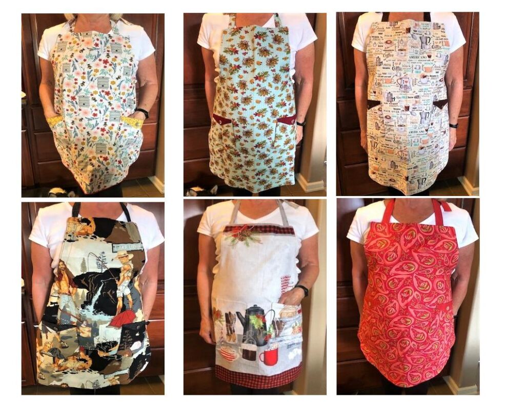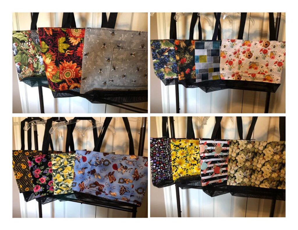 Useful mesh bottom shopping / beach bags, cute cross-body purses, fun kitchen aprons, pocket prayer quilts, kitchen towel sets, baby blanket sets and absolutely incredible handcrafted quilts.